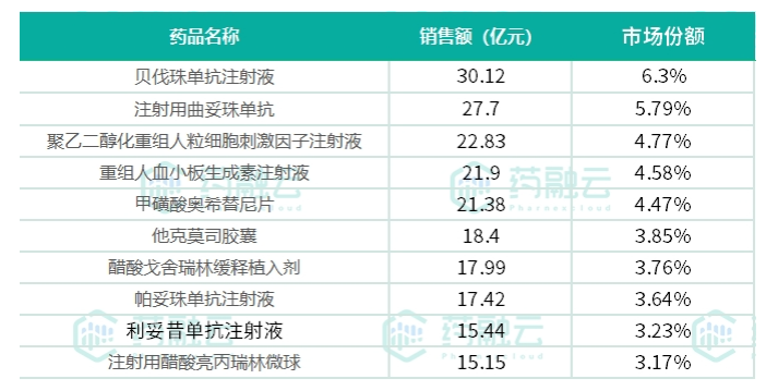 2023年全国医院抗肿瘤药和免疫机能调节药(化学或生物药)销售TOP10榜单中,贝伐珠单抗注射液、注射用曲妥珠单抗、聚乙二醇化重组人粒细胞刺激因子注射液、重组人血小板生成素注射液和甲磺酸奥希替尼片这5款产品表现尤为突出,销售额均超过20亿元。其中,贝伐珠单抗注射液以其6.3%的市场份额稳居首位,展现出强大的市场竞争力。