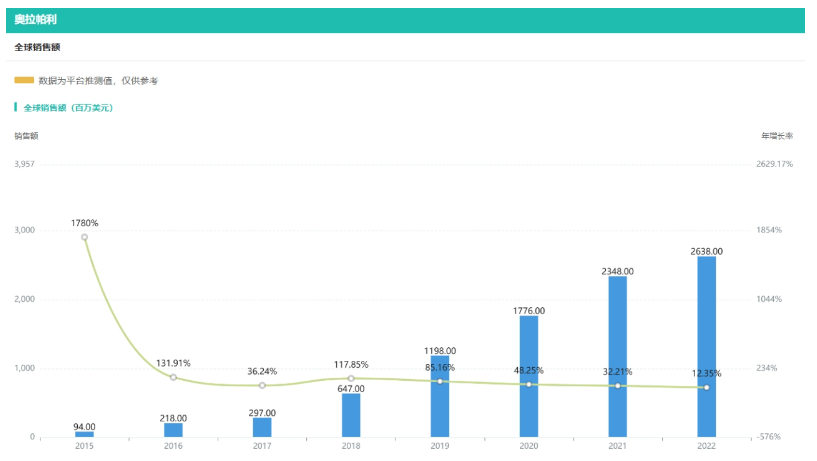 2014年12月19日,奥拉帕利获FDA批准用于治疗卵巢癌。截至目前,奥拉帕利已相继斩获卵巢癌、乳腺癌、去势抵抗性前列腺癌、胰腺癌、输卵管癌、腹膜癌等多项适应症。自上市以来,奥拉帕利的销售额逐年增长。阿斯利康2022年财报显示,奥拉帕利全年销售额已达26.38亿美元。