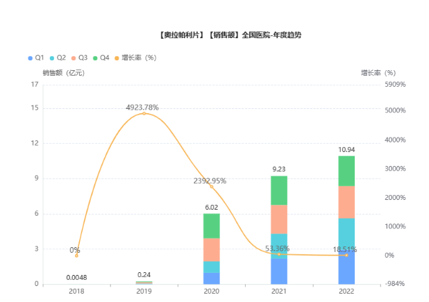 据药融云数据库,奥拉帕利片2022年院内销售额突破10亿元大关,同比增长18.5%,市场增长趋势明显。