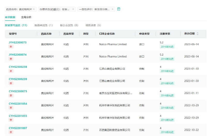 据药融云数据统计,目前奥拉帕利片已有江苏利泰尔药业、南京方生和医药、石药集团欧意药业、江西山香药业、中美华东制药等8家企业递交了仿制上市申请,其中齐鲁制药率先获批,斩获首仿。此次科伦制药是第2家斩获该品种的企业。