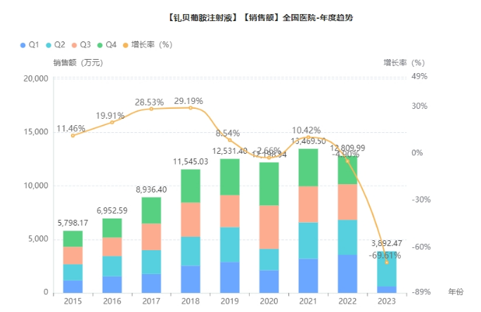 钆贝葡胺注射液(商品名为莫迪司)是一种用于肝脏和中枢神经系统的诊断性磁共振成像的顺磁性对比剂。为国家医保乙类品种,该产品此前在国内已有上海博莱科信谊(原研地产化)和意大利博莱科(原研)两家药企获批。据药融云数据统计,2022年在全国院内市场,钆贝葡胺注射液销售额超1亿元。