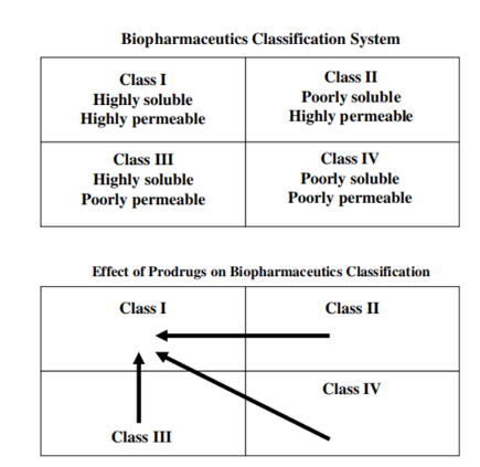 因为溶解度和渗透性都被认为是口服药物吸收的基本参数。已经提出了一种生物药剂学分类方案(BSC),根据药物的溶解性和渗透性将其分为四组。从生物利用度和药物递送的角度来看,属于I类的药物分子是最有前途的。如果II至IV类药物分子具有合适的前药衍生功能基团,则可以应用前药方法将分子从II至IV类改为I类(图3)。