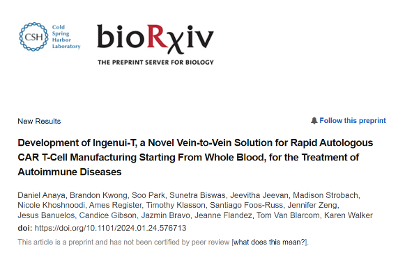 近日,一家T细胞疗法开发商Kyverna Therapeutics在BioRxiv上发表了一篇论文,表示Kyverna 创造了一种新型CAR-T细胞疗法生产工艺,这种名为“Ingenui-T”的技术只需不到300ml的全血,而不是单采。