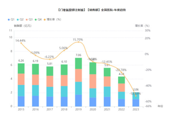 据药融云数据显示,门冬氨酸钾在2019年全国院内的销售额超7亿元,同比增长高达15.70%,一度展现出强劲的市场势头。然而,自2021年起,该品种被各地陆续移出省级医保目录,导致其销售收入呈一路下滑的趋势。2022年,门冬氨酸钾在全国院内销售额几近腰斩,销售额下降至4亿元,出现负增长趋势,而在2023年前三季度,它更是进一步萎缩至2亿元左右。