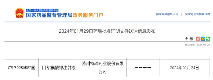 近日,据NMPA官网公示,苏州特瑞药业的门冬氨酸钾注射液通过一致性评价,据药融云数据统计,目前该品种国内仅5家企业获批。此次苏州特瑞药业是国内首家过评的企业。