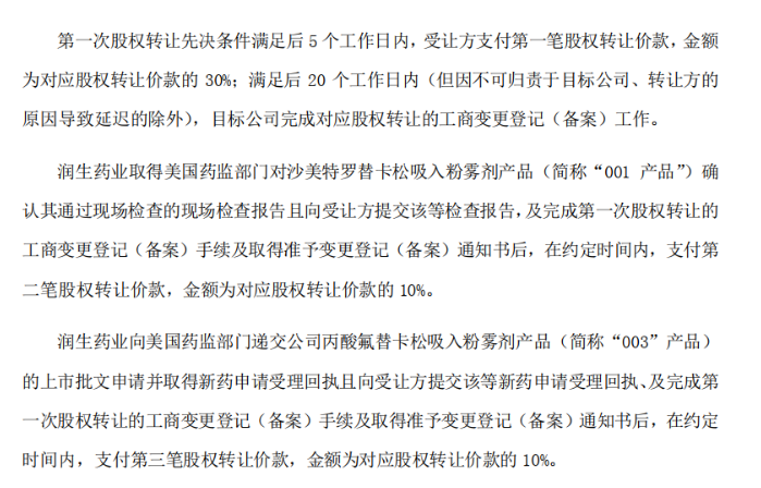 华润三九取得润生药业丙酸氟替卡松吸入粉雾剂产品上市后在中国大陆地区的独家经销及推广权利一揽子交易,签订《合作协议》,并按照约定价格安排签署具体的《股权转让协议》《增资协议》《股东协议》。