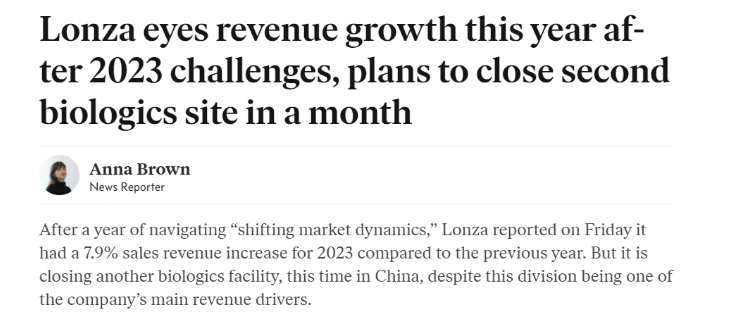 无独有偶,1月26日,CDMO巨头Lonza(龙沙)也关闭位于中国广州开发区新知识城的生物技术工厂。广州开发区工厂大约有400名员工,到2025年第一季度,将有约300名员工被解雇,不过仍将维持Lonza在中国的销售业务。