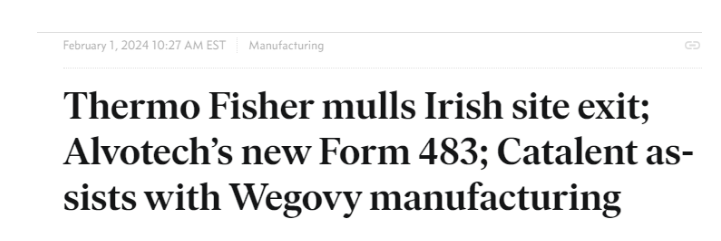 据Endpoint news报道,Thermo Fisher正在审查爱尔兰阿斯隆工厂的运营情况,该工厂可能在未来两年内关闭,如果关闭,将影响该工厂的仓库运营,最多可能影响60名员工。Thermo Fisher正处于与今年可能受到影响的同事进行协商的早期阶段。在赛默飞世尔于 2021 年收购CRO之前,该工厂曾归PPD 所有。