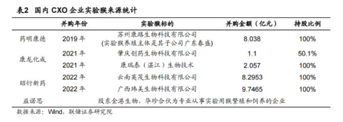 国内部分CRO龙头企业自2019 年开始布局上游实验猴供应商赛道。2019 年药明康德收购了广东春盛猴场;2021 年康龙化成收购了肇庆创药、康瑞泰,2022 收购了安凯毅博;2022 年昭衍新药花费18亿元的大手笔收购了广西玮美生物和云南英茂生物。以下四家公司分别采取并购实验猴养殖企业,或者由实验猴养殖企业入股的形式,锁定实验猴的原材料成本。
