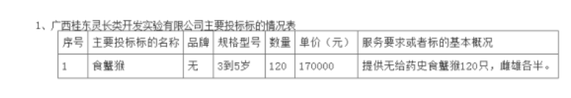 2023年4月7日,中国食品药品检定研究院食蟹猴采购项目中标(成交)结果公告显示,食蟹猴的中标价格为17万元/只。