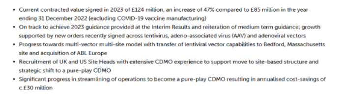 (3)在精简运营以成为纯粹的CDMO方面取得重大进展,每年节省约3000万英镑的成本。