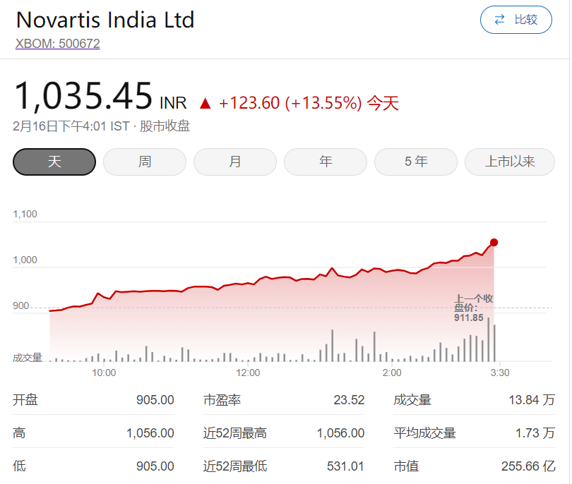 诺华印度是一家在印度证交所上市的公司。根据这家瑞士制药公司的年度报告(PDF),以2023年底的收盘价计算,母公司拥有的股票价值1.61亿美元。