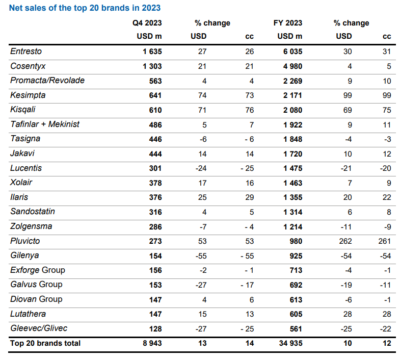图:2023年诺华前20大品牌的净销售额