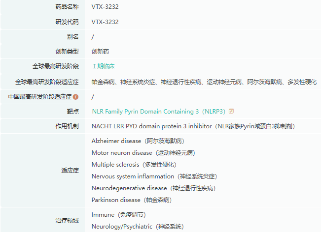 VTX3232是一种新型中枢神经系统(CNS )渗透性NLRP3抑制剂,目前处于I期临床试验阶段,2023年6月完成首例受试者给药,研究数据预计2024年一季度公布。