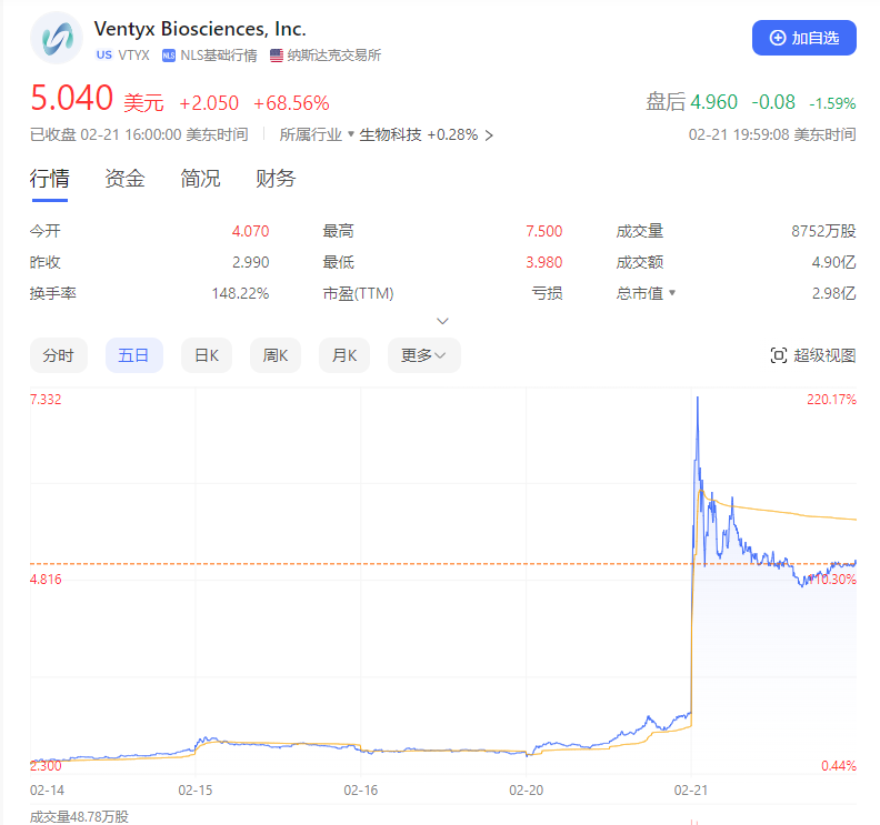 而在国外,一家生物制药公司Ventyx Biosciences也因研发药物具有减重效果,而被分析师点评,受此影响,2月21日,Ventyx股价大涨69%。Ventyx于2021年在纳斯达克上市,目前市值约3亿美元。