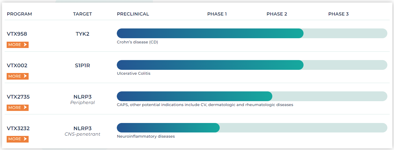 除了VTX3232,Ventyx还有一款NLRP3抑制剂VTX2735,用于家族性寒冷性自身炎症综合症,目前处于2期试验阶段。