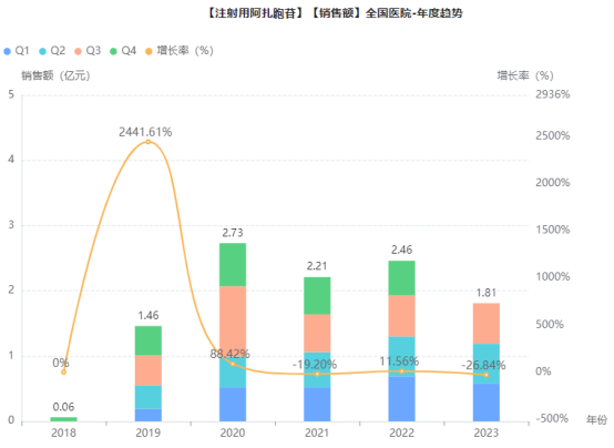 阿扎胞苷是一种天然存在的胞嘧啶核苷类似物,属于尿苷激酶和DNA去甲转移酶抑制剂,通过引起DNA去甲基化和对骨髓中异常造血细胞的直接细胞毒作用产生抗肿瘤作用。据药融云数据统计,近年注射用阿扎胞苷在全国院内销售额平稳增长,2022年销售额近3亿元,同比增长达11.56%,2023年销售额近2亿元。