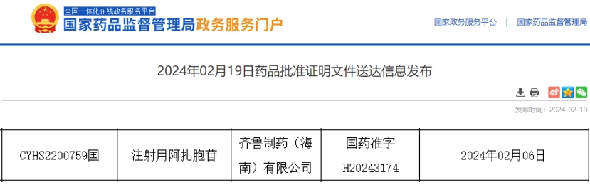 近日,据NMPA官网公示,齐鲁制药递交的4类仿制化药注射用阿扎胞苷的上市申请获批并通过一致性评价。目前齐鲁制药已有154个品种过评,其中53个为首家。