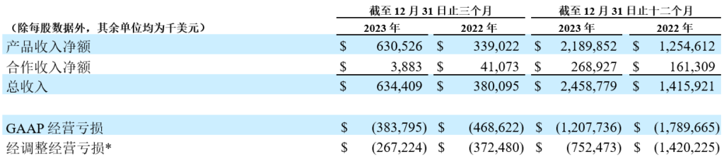 2023年第四季度总收入为6.344亿美元,23年全年收入约25亿美元,增加了约10亿美元,同比增长 74%。同时与2022年相比减少了约11亿美元的净亏损。本季度总收入较上年同期增长主要得益于公司核心市场产品销售额的增长。