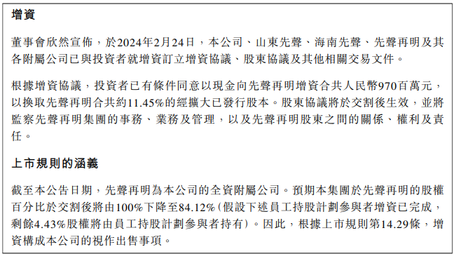 交割后,预期先声药业集团于先声再明的股权百分比将由100%下降至84.12%。