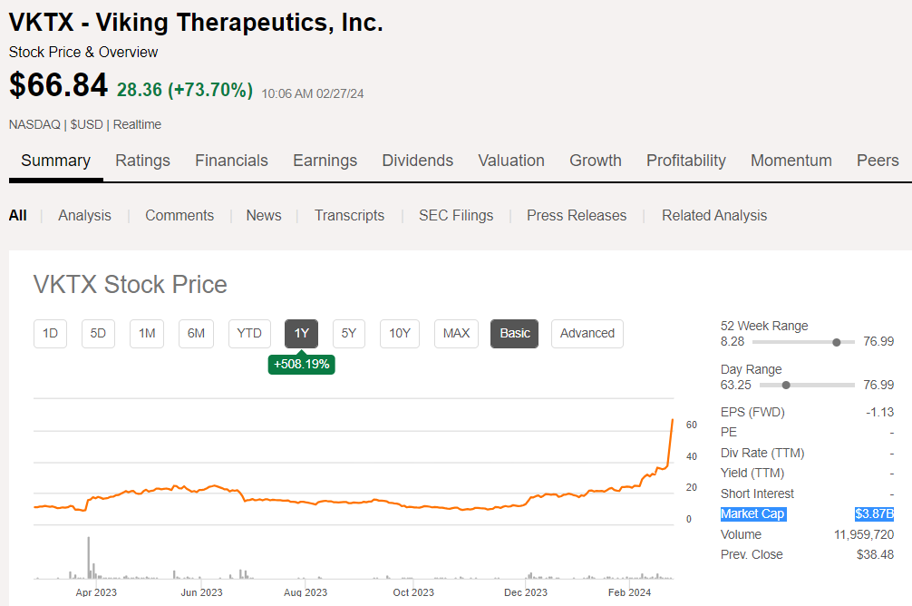 2月27日,Viking Therapeutics宣布其GLP-1/GIP双受体激动剂VK2735 二期试验取得积极结果。受此影响,Viking 股价在早盘交易中暴涨70%,过去一年,该股股价累计上涨500%,目前市值达38.7亿美元。