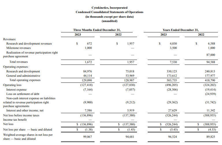 2024年2月27日,Cytokinetics公司(纳斯达克股票代码:CYTK)公布了第四季度及2023年全年财报:2023年公司总营收为753万美元,同比下降92%;2023 Q4总营收167.2万美元,同比下降15%,收入减少的主要原因是2022年确认了8700万美元的递延收入,这是含mavacamten产品净销售额的特许权使用费,是特许权使用费义务解除的结果。