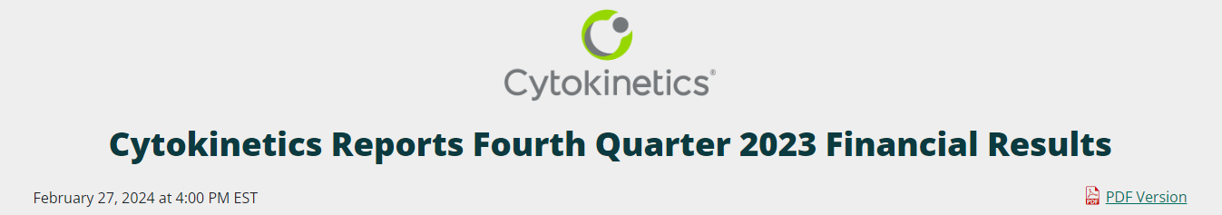Cytokinetics公司总裁兼首席执行官Robert I. Blum表示:“我们在2023年结束时取得了SEQUOIA-HCM的积极成果,这将推动我们公司进入下一阶段的规划,实现我们的专科心脏病学业务模式。在我们准备aficamten的监管申请时,我们正在开展商业准备活动,同时还在oHCM和nHCM患者中开展3期临床试验,我们相信这将进一步为我们的下一步目标提供证据支持,以帮助更多的肥厚型心肌病患者。凭借强大的资产负债表、充裕的现金流和多种资金渠道,我们很高兴能为 Cytokinetics 和所有利益相关者翻开新的一页。”