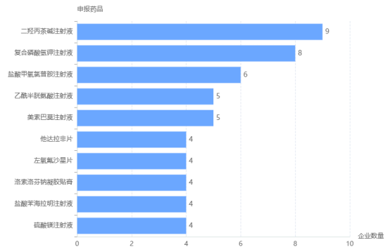 从受理品种来看,二羟丙茶碱注射液、复合磷酸氢钾注射液、盐酸甲氧氯普胺注射液3个品种的相关申报企业数最多。