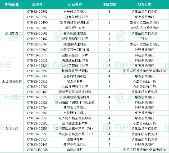 据药融云数据库统计,2024年2月,CDE共承办332条新注册分类仿制药申报受理号和79条一致性评价补充申请,涉及药企超300家。在申报品种数量上,康瑞华泰、浙江深海医药和鲁南制药(以集团计)3家企业的表现尤为抢眼,共同成为本月最大的“卷王”,3家企业均申报了9个药品。