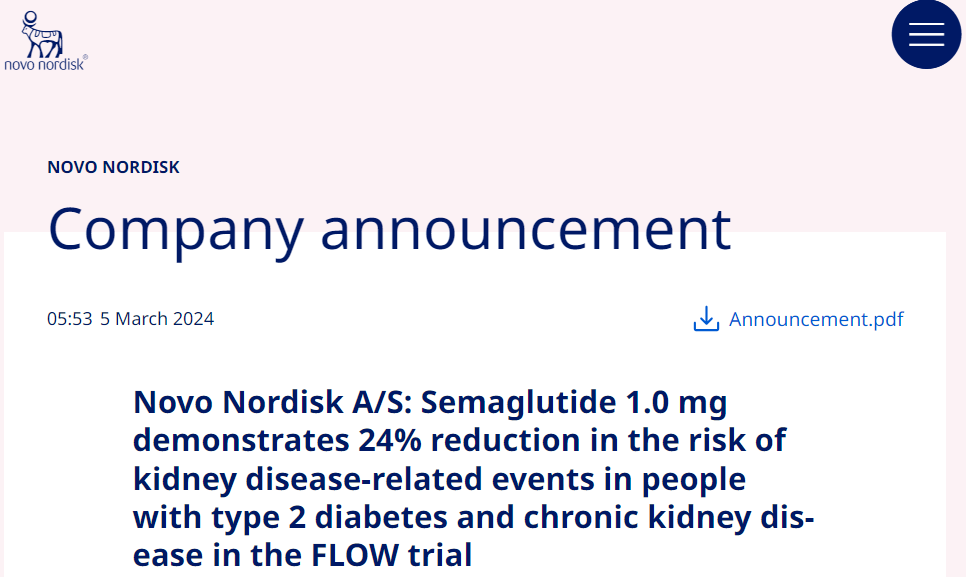 3月5日,诺和诺德公布其GLP-1药物司美格鲁肽注射版(1.0mg)III期FLOW试验达到主要终点,可使2型糖尿病和慢性肾病(CKD)患者发生肾病相关风险降低24%。