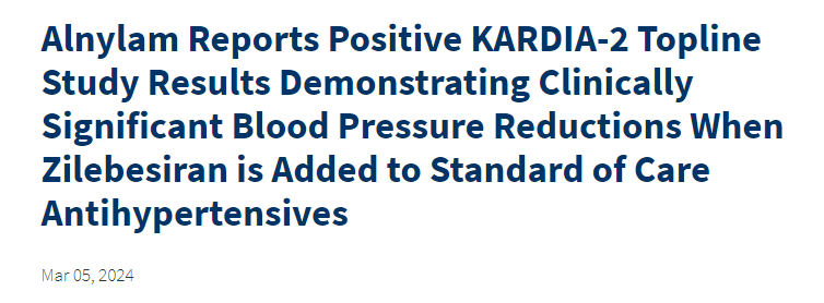 3月5日,RNAi 疗法公司Alnylam Pharmaceuticals(纳斯达克股票代码:ALNY)宣布用于治疗高血压的在研 RNAi 疗法zilebesiran的KARDIA-2 2期研究达到了主要终点。研究的主要终点是第3个月时经动态血压监测(ABPM)评估的24h平均收缩压(SBP)相比于基线的变化。