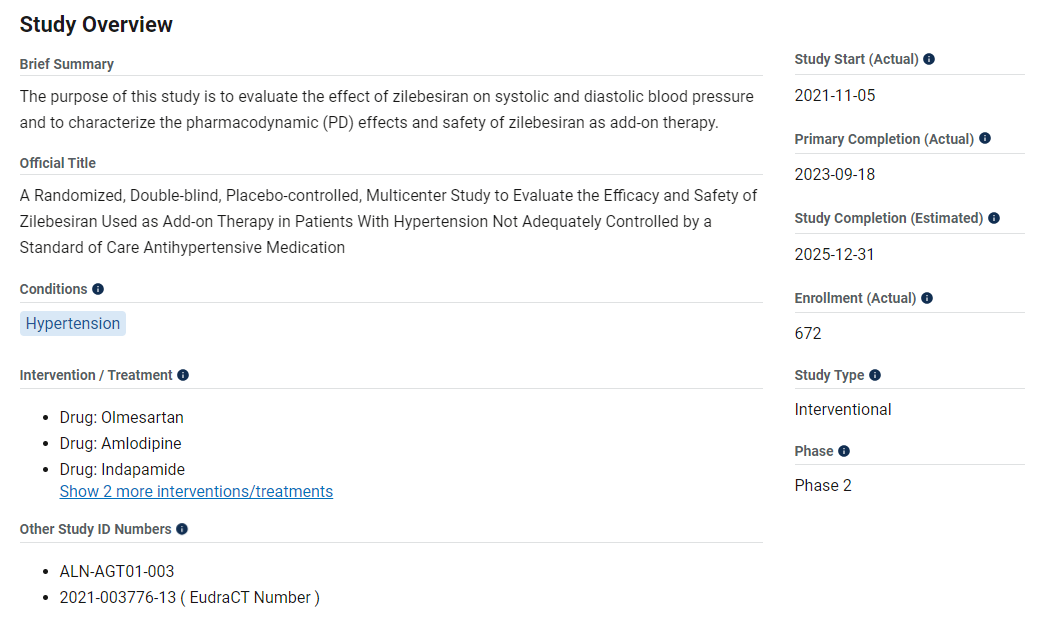 在筛选期间符合所有纳入标准的患者首先被随机分为三个组,接受抗高血压药物奥美沙坦酯、氨氯地平或吲达帕胺的持续至少四周开放标签治疗。而后,符合条件的患者将被随机分配接受600 mg zilebesiran或安慰剂组治疗六个月。