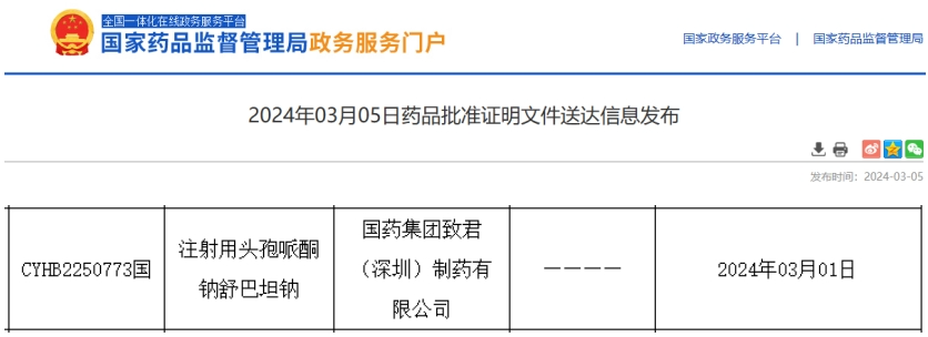 日前,据NMPA官网公示,国药集团的注射用头孢哌酮钠舒巴坦钠通过仿制药一致性评价。据药融云数据统计,该品种在2023年全国院内销售额超56亿元。