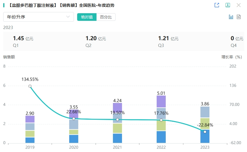 盐酸多巴酚丁胺注射液原研是礼来,主要用于器质性心脏病时心肌收缩力下降引起的心力衰竭,包括心脏直视手术后所致的低排血量综合征,作为短期支持治疗。该品种是国家基药品种、2023年国家医保甲类品种。药融云数据精准统计显示,盐酸多巴酚丁胺近年来在全国院内的销售表现极为亮眼,其销售额呈现出迅猛的增长态势。2022年,全国院内销售额已突破5亿元大关,同比增长率高达17.76%,展现了其强大的市场潜力和临床需求。