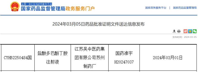 近日,据NMPA官网公示,江苏吴中医药集团苏州制药厂(江苏吴中医药集团子公司)的盐酸多巴酚丁胺注射液通过仿制药一致性评价。据药融云数据统计,目前江苏药企已有9个品种过评。