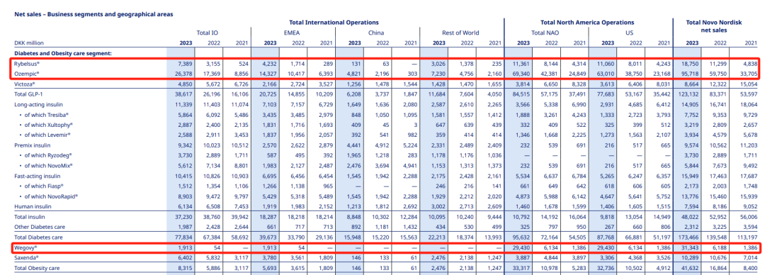 诺和诺德报告称:由于其GLP-1药物销售强劲,2023年利润大幅飙升。司美格鲁肽2023年全年总销售额已达到1458.11亿丹麦克朗,约212.0亿美元,是公司最大的“印钞机”。其中Rybelsus(口服司美格鲁肽)2023年卖出187.50亿丹麦克朗(约合27.21亿美元),Ozempic(注射司美格鲁肽)卖出957.18亿丹麦克朗(约合138.92亿美元),Wegovy(减肥版司美格鲁肽)也卖出313.43亿丹麦克朗(约合45.49亿美元)。