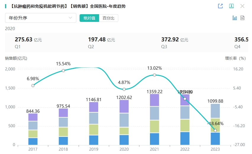 SYH2039则是一种高效的甲硫氨酸腺苷转移酶2A(MAT2A)抑制剂,能够针对性地杀灭非小细胞肺癌、胶质瘤、胃食管癌、胰腺癌和膀胱癌等多种MTAP缺失型肿瘤细胞,同时对正常细胞的影响微乎其微,有望成为同类药物中的佼佼者,展现出巨大的抗肿瘤药物潜力。据药融云数据统计,近年来,抗肿瘤药和免疫机能调节药在全国院内销售峰值超千亿元,2023年全国院内销售额超1千亿元。