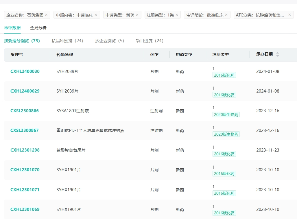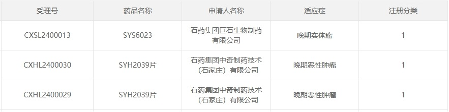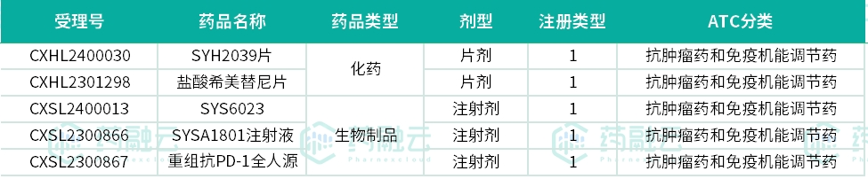 2024年至今,已有SYH-2039片、SYS-6023、SYSA-1801注射液、恩朗苏拜单抗注射液、盐酸希美替尼片5款1类新药申请并获批临床。其中小分子化药2款,大分子药物有3款。