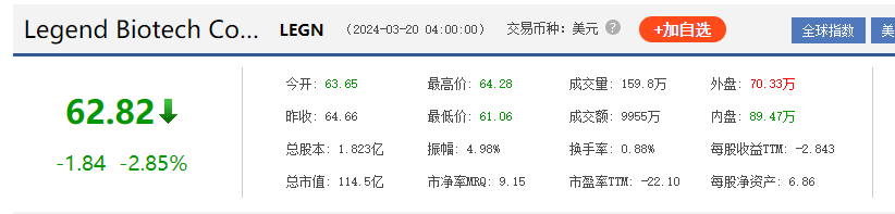 传奇生物目前每股价格62.82美元,市值114.5亿美元,较去年同期增长27%。