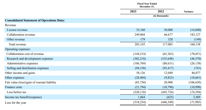 财报显示,2023年传奇生物总营收2.85亿美元,同比增长143.7%;合作收入2.5亿美元,同比增长275%,主要由与杨森协议相关的CARVYKTI®销售额增加驱动的;研发费用3.82亿美元,同比增长13.9%,主要是cilta-cel的持续研发活动,包括3期临床试验患者入组率增加以及其他管线产品研发活动增多导致的。