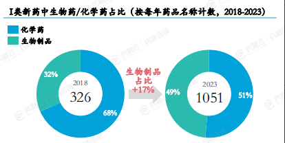 2018-2022年,获受理I类新药中生物制品数量和占比保持持续增长,2022年生物制品占比超过化药。2023年我国受理I类新药数量爆炸式增长,生物制品数量与化学药数量几乎持平,生物药占比较2018年增长17%。