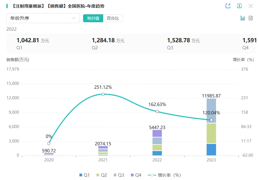 塞替派是乙烯亚胺类烷化剂的代表,主要用于治疗卵巢癌、乳腺癌、膀胱癌和消化道癌,同时还适用于成人和儿童患者自体或同种基因造血祖细胞移植前的预处理。据药融云数据统计,注射用塞替派在全国医院内的上线销售额呈现出稳健的增长趋势。2022年销售额达5447万元,同比增长达163%,2023年在全国院内(数据截至2023年Q3)市场销售额突破1亿元,同比增长达120%。