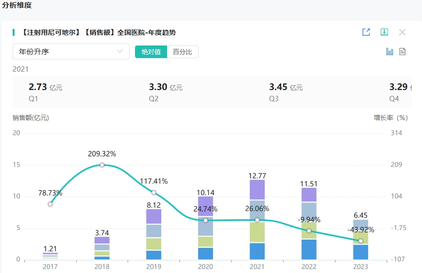 尼可地尔原研来自日本中外制药株式会社,为冠心病常用药物,是一种同时具有钾离子通道开放剂作用和类硝酸酯作用的血管扩张剂,用于治疗不稳定型心绞痛。尼克地尔片于1984年作为抗心绞痛药物在日本上市销售;1993年,注射用尼可地尔获批上市,注射用尼可地尔是一种钾通道开放剂,临床上主要用于治疗不稳定型心绞痛。据药融云数据显示,注射用尼可地尔在2022年全国院内市场销售额超11亿元。