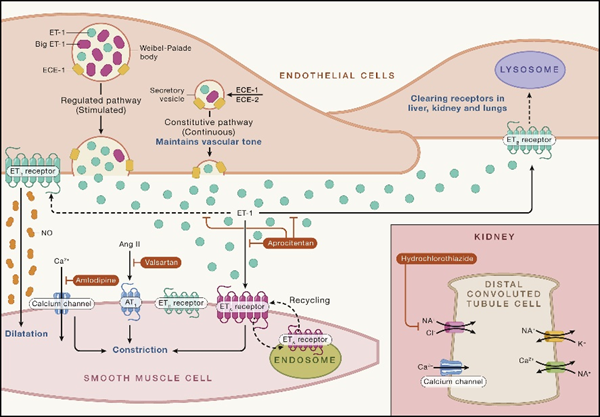 Tryvio的有效成分为Aprocitentan,可抑制内皮素-1(ET-1)与内皮素受体A(ETA)和内皮素受体B(ETB)受体的结合。ET-1及其受体在血管内皮和血管平滑肌细胞中高表达,对血流动力学动态平衡起重要的调节作用。ET-1是包含21个氨基酸的肽类,能够不可逆地与其受体结合,是目前最强的、持续时间最长的血管收缩剂。在高血压中,ET-1还可导致内皮功能障碍、血管肥大和重塑、交感神经激活和醛固酮合成增加。由于内皮素和内皮素受体相互作用的存在,可能是目前现有药物无法控制血压的原因之一。