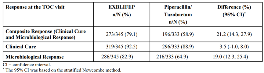 在临床治愈和微生物学根除的主要复合终点方面,与哌拉西林/他唑巴坦相比,头孢吡肟/恩美他巴坦达到非劣效性和优效性标准。
