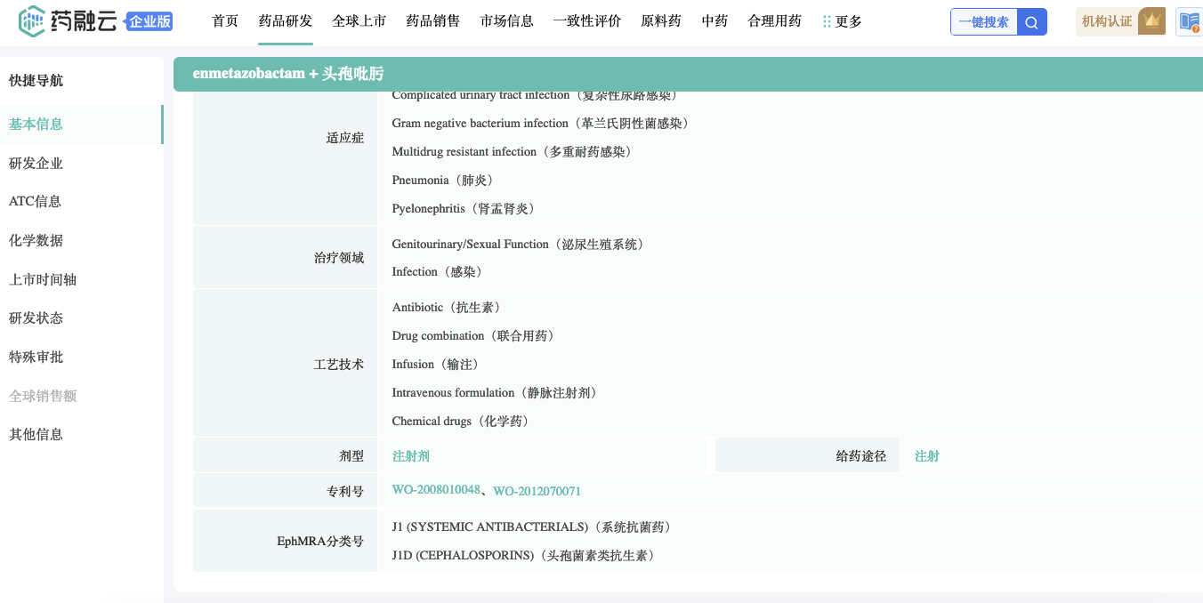 药融云数据监测显示:早在2020年12月21日,扬子江药业集团(YRPG)的子公司上海海尼药业有限公司和Allecra Therapeutics宣布,两家公司签署了独家许可协议,根据该协议,上海海尼将在大中华地区(包括中国大陆,香港,澳门和中国台湾)生产,开发和商业化头孢吡肟/恩美他巴坦(Cefepime/enmetazobactam)。