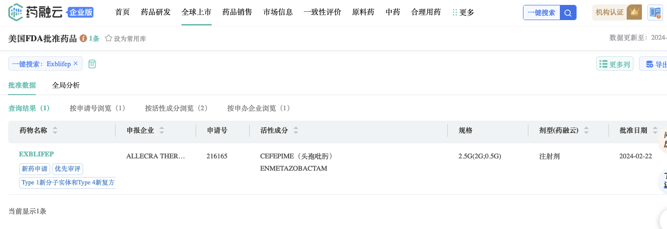 2024年2月22日,美国食品药品监督管理局(FDA)批准Allecra Therapeutics研发的新分子实体药物Exblifep上市,适用于治疗由指定易感微生物引起的复杂性尿路感染(cUTI)(包括肾盂肾炎)患者。本品已经获得美国FDA授予的合格传染病产品资格(QIDP)。2023年6月递交美国新药上市申请(NDA)。