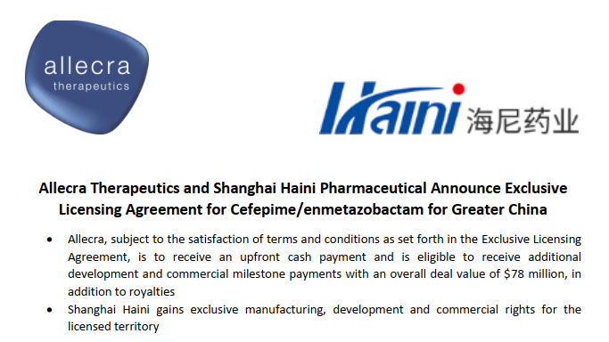 根据该协议的条款,上海海尼负责在许可地区内头孢吡肟/恩美他巴坦的生产,开发和商业化,包括商业生产以及所有相关费用。在满足独家许可协议中规定的条款和条件的前提下,Allecra在签署时获得首付款项,并有资格获得头孢吡肟/恩美他巴坦的进一步开发和销售里程碑,总交易价值为7800万美元,以及在许可区域内的特许权分层销售版税。