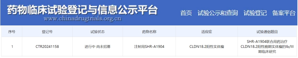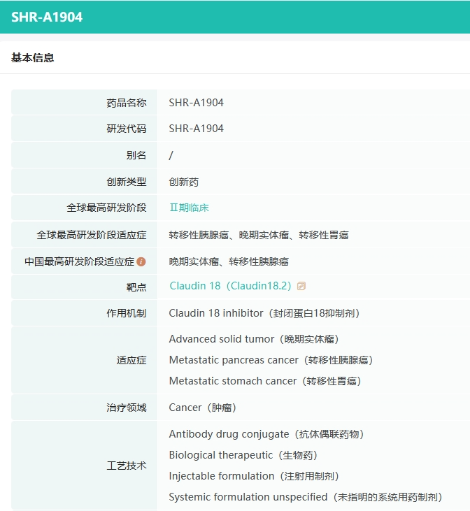 SHR-A1904是恒瑞医药自主研发的一款针对Claudin 18.2的ADC药物。它能够精准地与肿瘤细胞表面的靶抗原结合,随后被细胞内吞,进而释放小分子毒素,有效杀伤肿瘤细胞。据ClinicalTrials官网显示,恒瑞医药已在美国启动了SHR-A1904的1/2期临床研究,旨在全面评估该药物在晚期实体瘤患者中的安全性、耐受性、药代动力学特性及初步疗效,为未来的治疗策略提供有力支持。