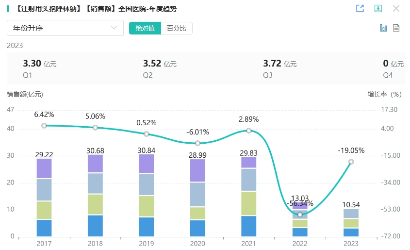 据药融云数据统计,注射用头孢唑林钠在2018年全国院内市场销售额突破30亿元大关,2022年全国院内市场销售额超13亿元,2023年,截止Q3的最新数据显示,其全国医院市场销售额近11亿元。